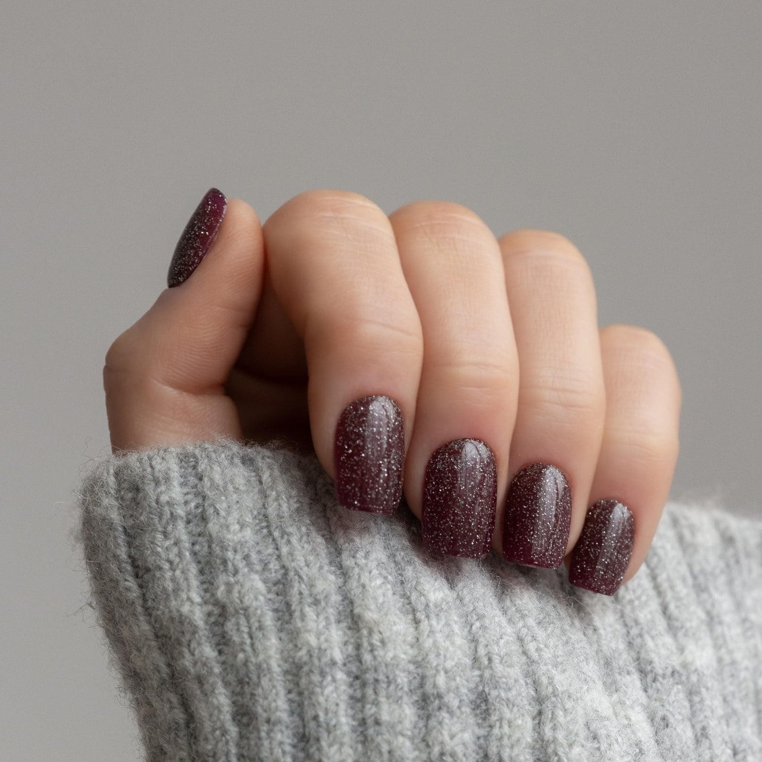 Dużo brokatu na ciemnoczerwonych paznokciach na idealny glam!