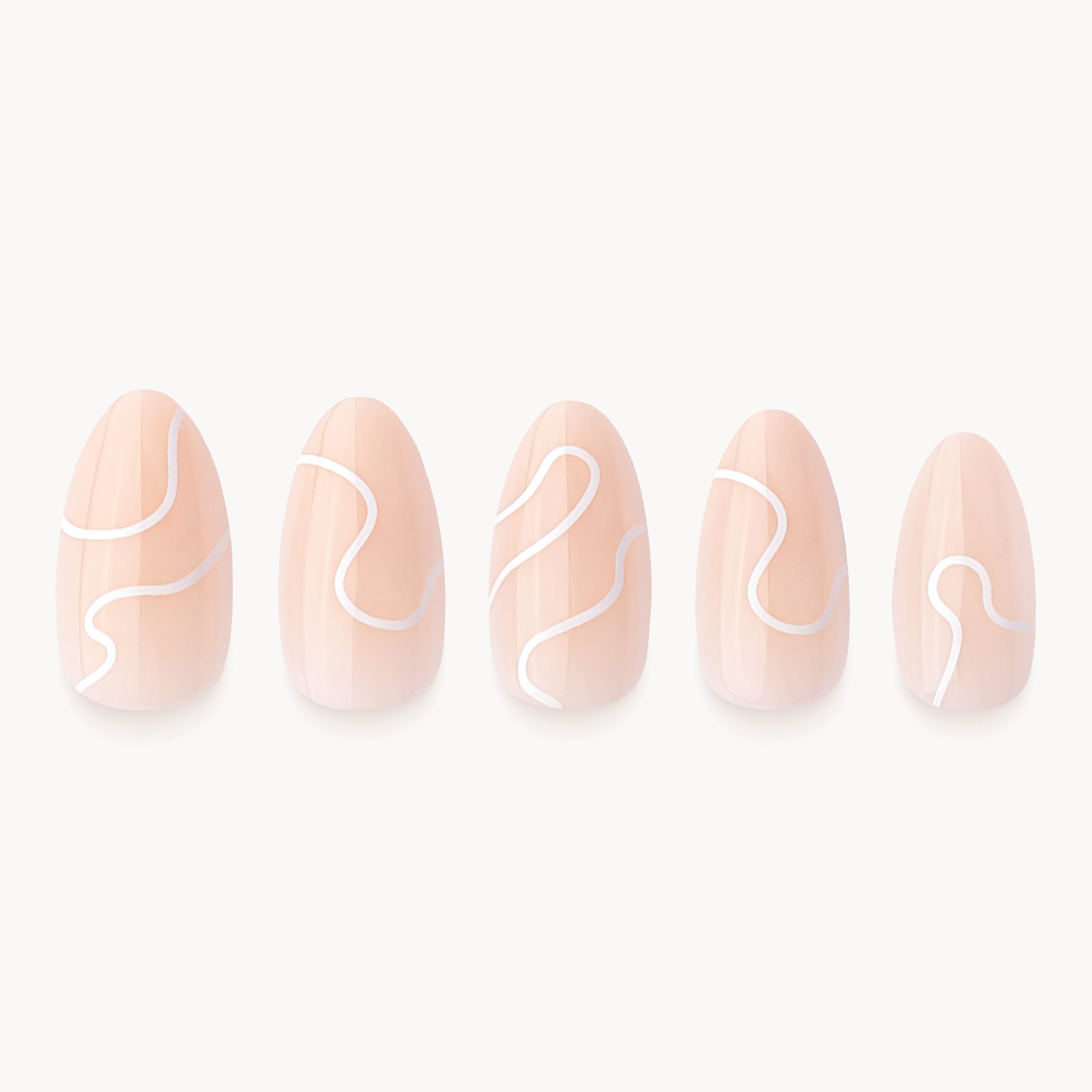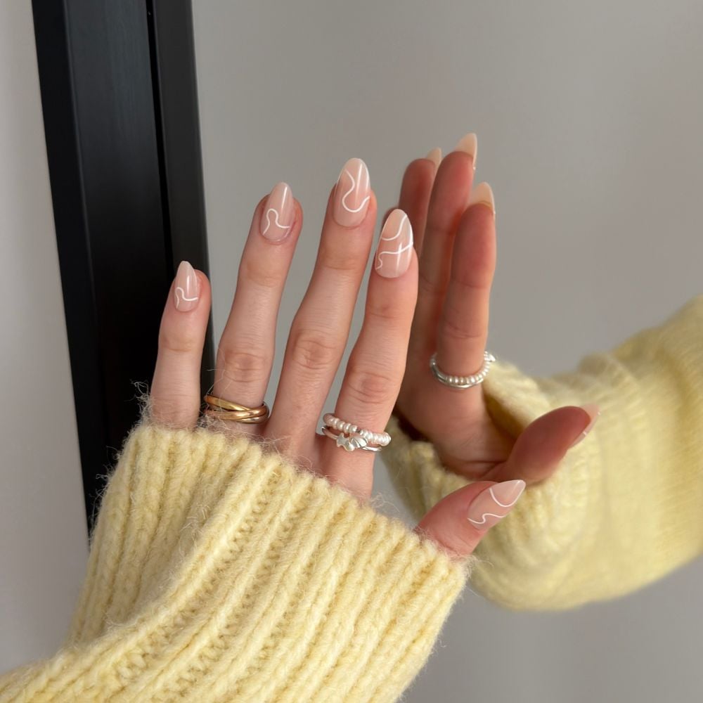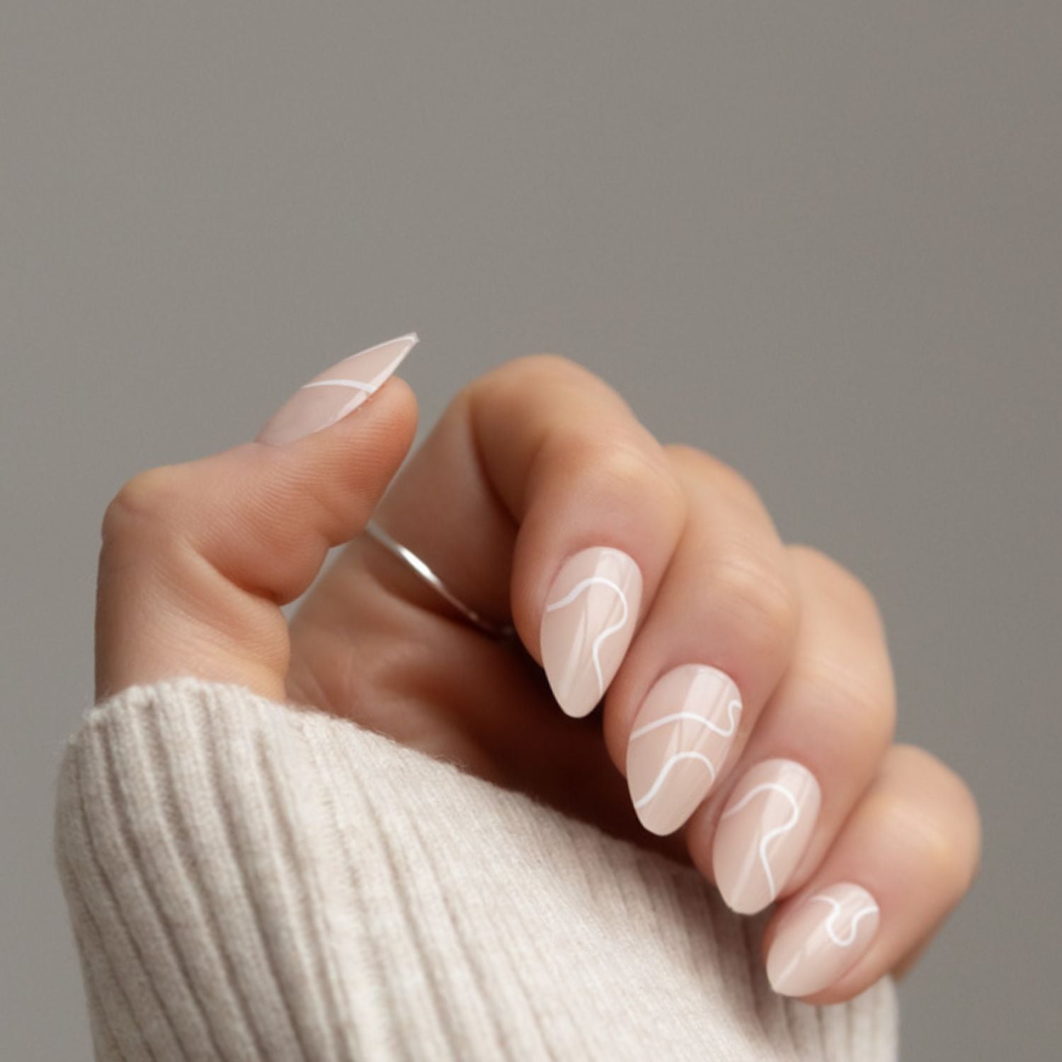 Jeżeli minimal design ma swój idealny manicure — to właśnie Delicate. Półprzezroczysta, neutralna baza w połączeniu z delikatnym, białym wzorem tworzy efekt subtelnej elegancji bez przesady. Cienka biała linia dodaje charakteru, ale wciąż pozostaje bardzo „clean” i lekka. To propozycja dla fanek estetyki less is more i nowoczesnego minimalizmu.