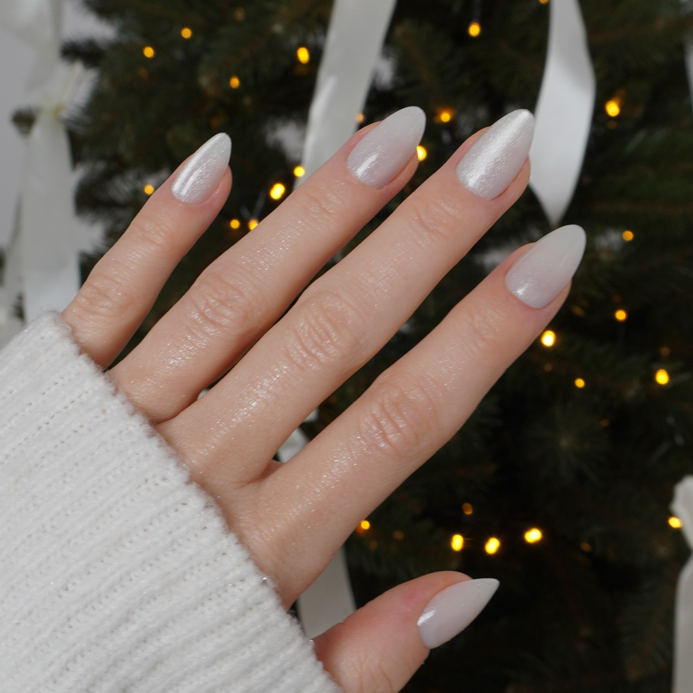 Frost to definicja „frosted glass nails” w najbardziej eleganckim wydaniu. Srebrzysty, perłowy shimmer tworzy efekt mglistego szkła, delikatnego połysku i zimowej subtelności. Ten model wygląda jak dotyk śniegu na płytce — minimalistyczny, chłodny i absolutnie zachwycający w świetle.