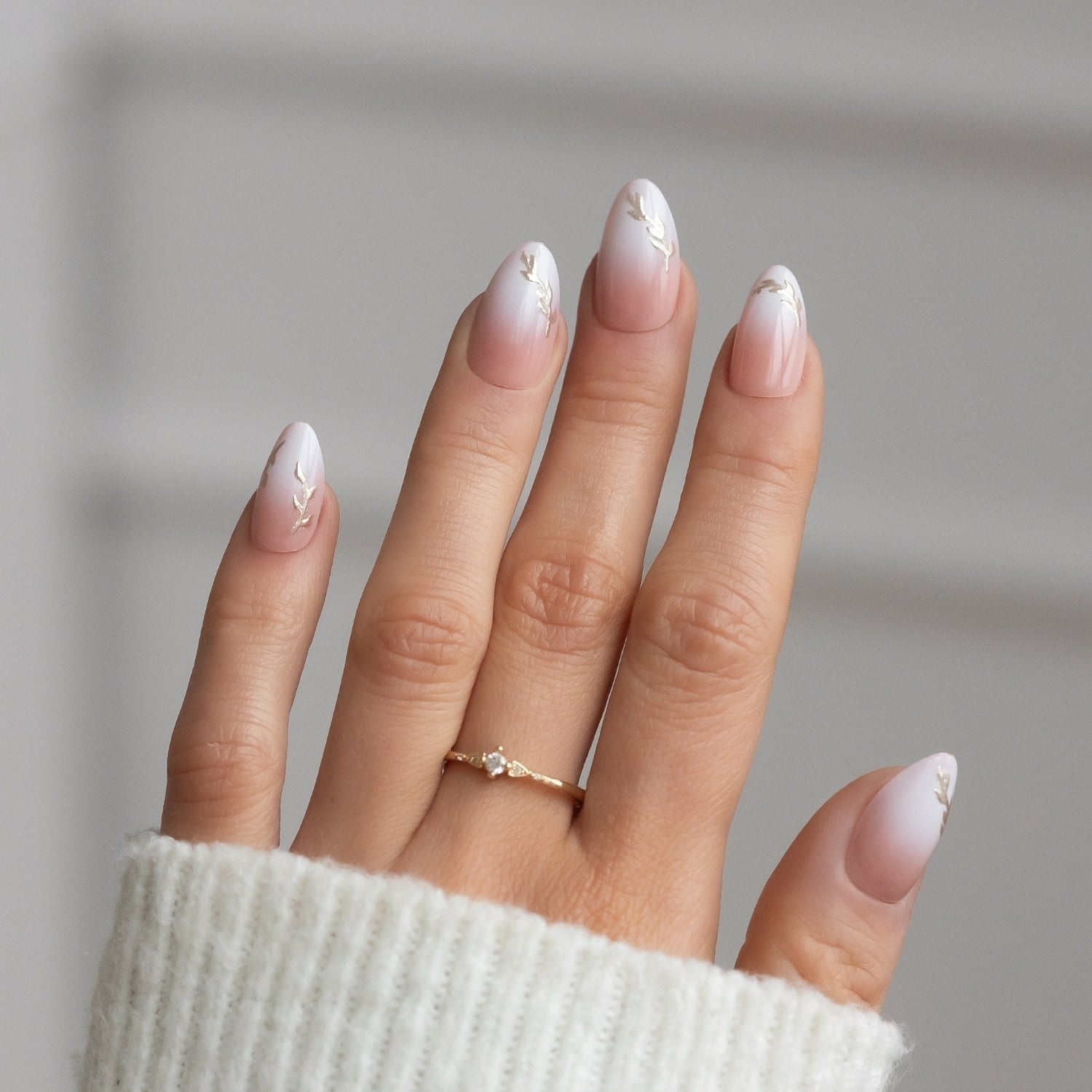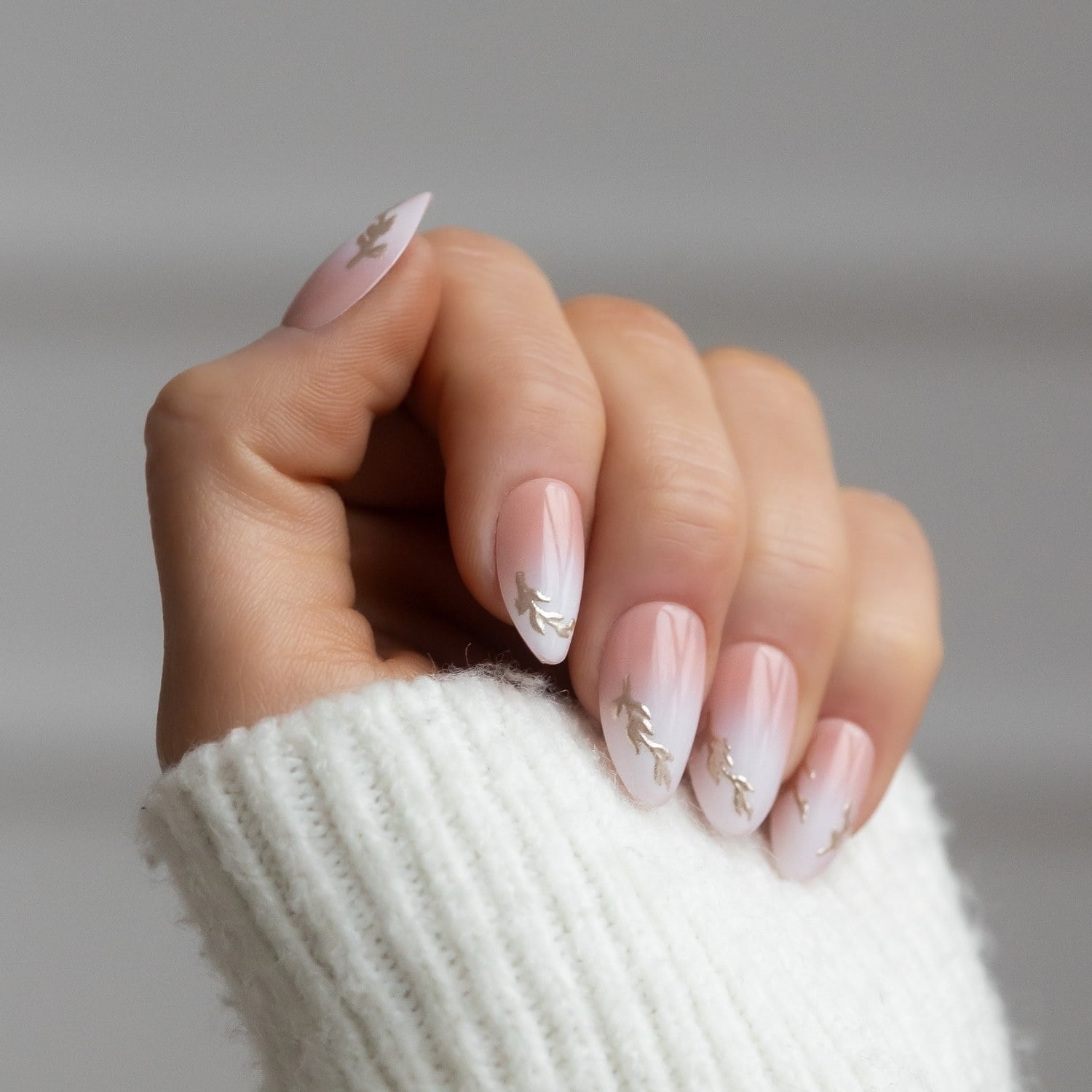 Delikatny efekt baby boomer – czyli subtelne przejście z mlecznej bazy w naturalny róż – nadaje paznokciom lekkości i klasy, a złote, trójwymiarowe gałązki dodają im biżuteryjnego charakteru. To wykończenie przyciąga spojrzenia, ale pozostaje gustowne i wyważone.